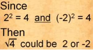 Since 2 squared equals 4 and negative 2 squared equals 4, this means that the answer to finding the square root of 4 could be 2 or negative 2 .